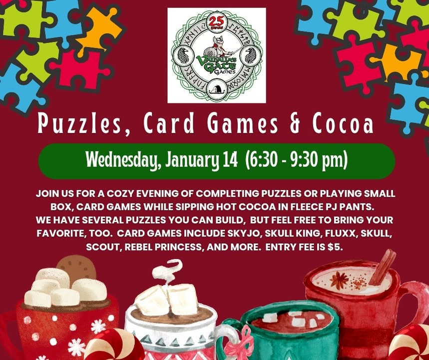 Want to share in a cozy evening but puzzles aren't your thing? Come play one of our small box card games and join the conversation. This will still be a fun evening of puzzles and cocoa so bring your favorite puzzle to complete.