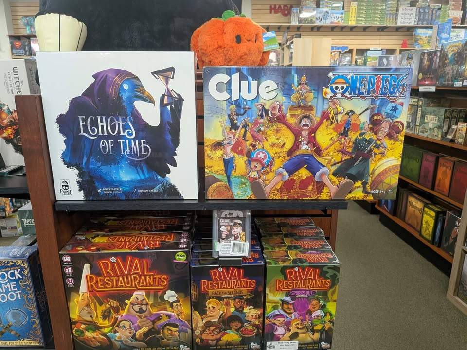 Newly arrived games include Clue One Piece, Echoes of Time, and Rival Restaurant expansions - Sporks Out and Back on Seconds, plus a restock on the base game.
