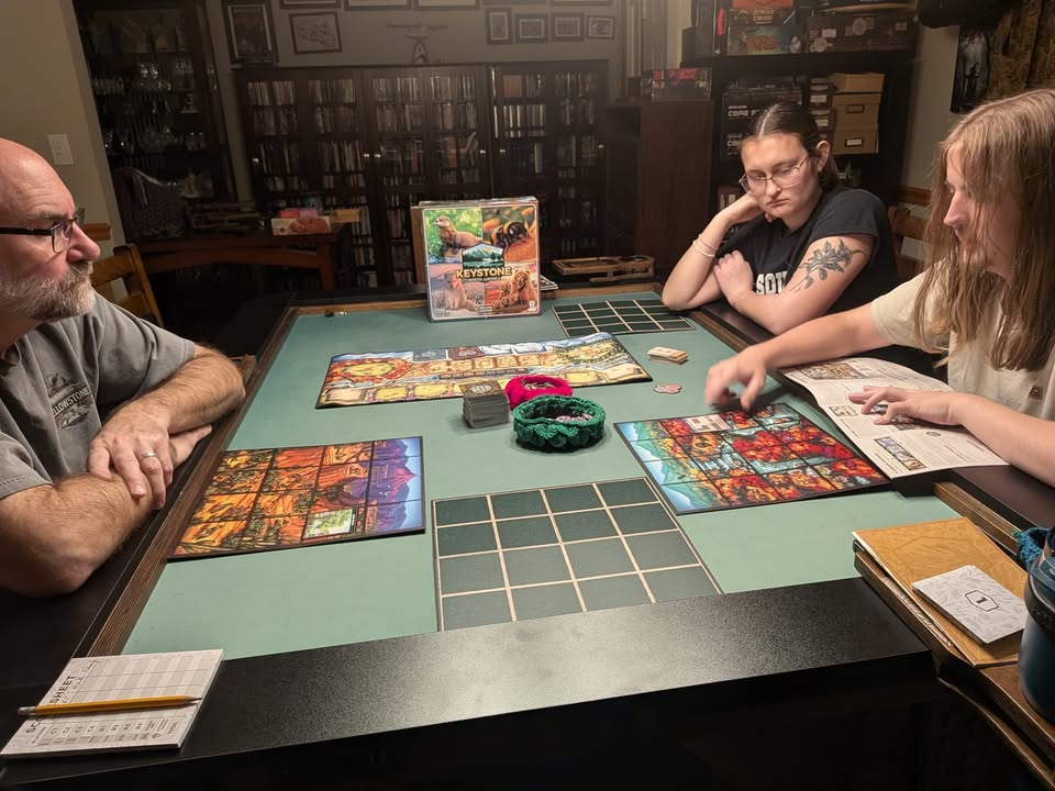 Tonight's family game was Keystone North America by Rose Gauntlet. Everyone enjoyed this puzzly game of building ecosystems. The art is pretty. It's not difficult to get started, but there are enough skills, strategies, and card changes for replayability. We would definitely play again.