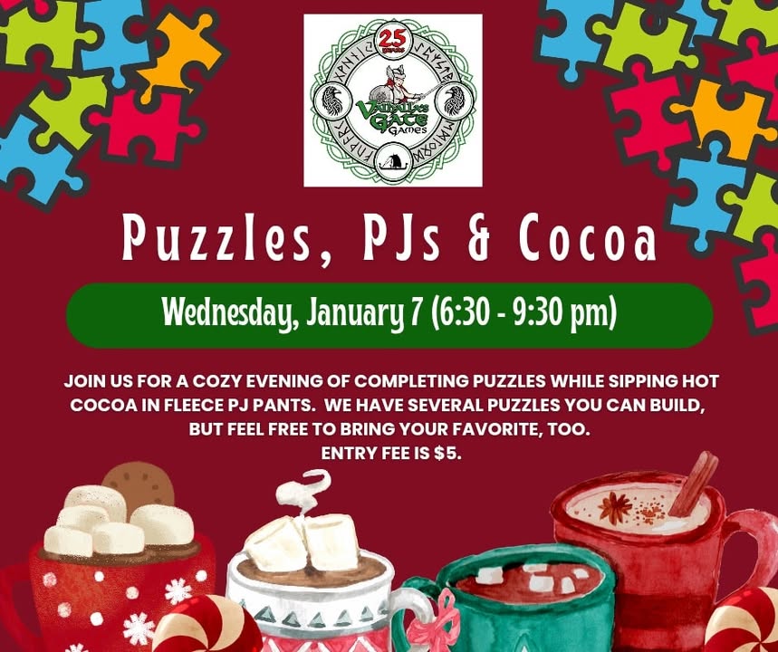Join us on January 7th for another cozy evening of building puzzles while sipping hot cocoa. The Gate will remain open until 10 pm, so this event will be a little longer. Facebook post 2025-12-18 09:01:16 |