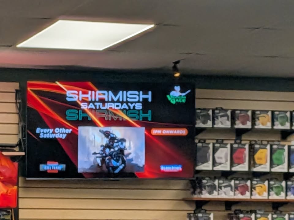 Today, we got the TVs set up to show VG slides. Eventually, we will add product slides and videos. The TV in the card center still needs a cable run so we can show pairings.
